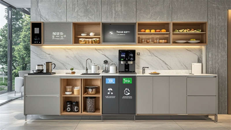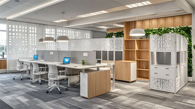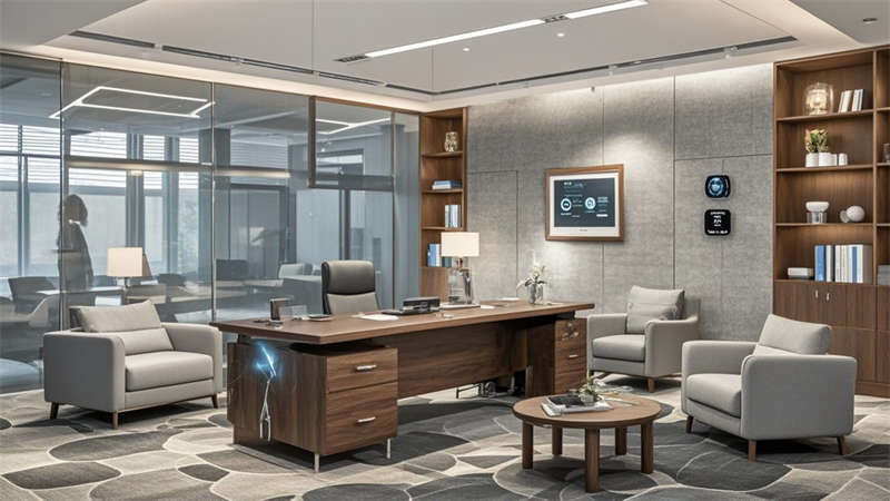 ④聲學吊頂確保35分貝以下靜音環境。色彩搭配采用70%淺灰奠定基調,20%原木色增添溫暖,10%企業藍作為點睛色。環保方面選用LEED認證材料,集成光伏玻璃幕墻年發電量達8萬度。