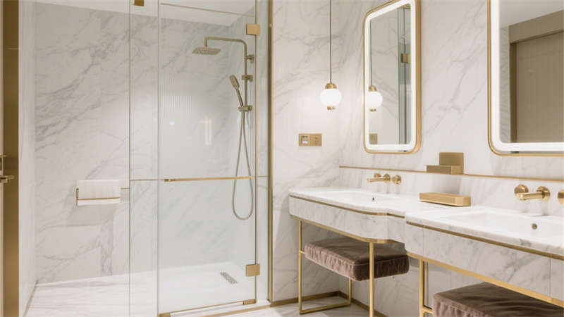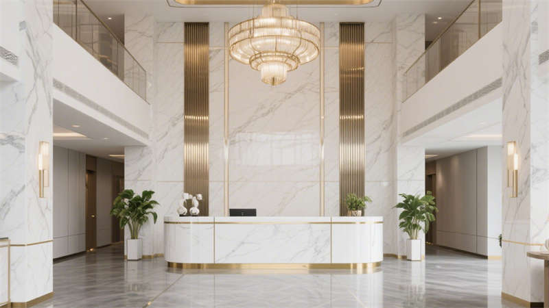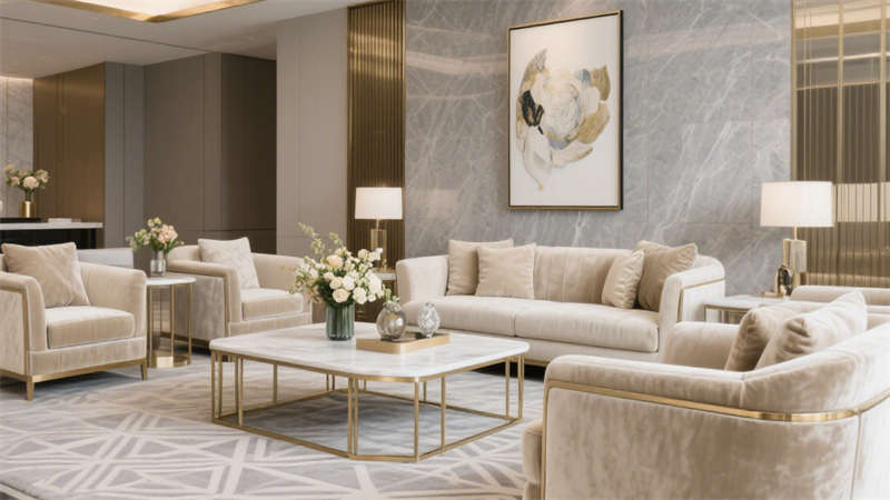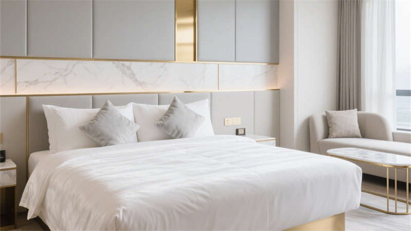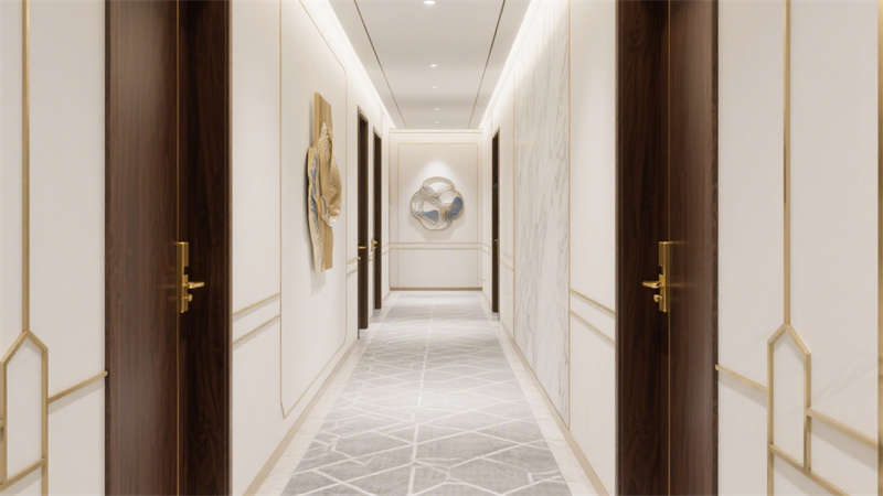 本設計以輕奢風格為核心,通過柔和的基底色調與精致的細節搭配,構建出兼具質感與舒適度的酒店環境。空間以米白色與淺灰色為基礎,巧妙融入金色金屬線條作為點綴,既避免了過度奢華的厚重感,又增添了空間的精致度。墻面與地面選用細膩的大理石紋理材質,在光線映襯下呈現出自然的光澤,提升整體空間的高級感。家具選型注重線條的簡約流暢,搭配柔軟的布藝軟裝,營造出溫馨舒適的居住氛圍。各個區域在設計上保持風格統一,從公共空間到客房區域,都延續了輕奢的設計語言,讓整體空間既富有格調,又能給人帶來放松愜意的居住體驗。