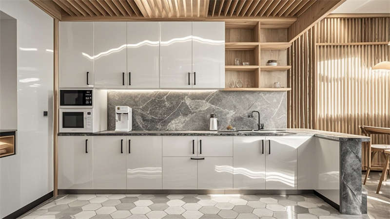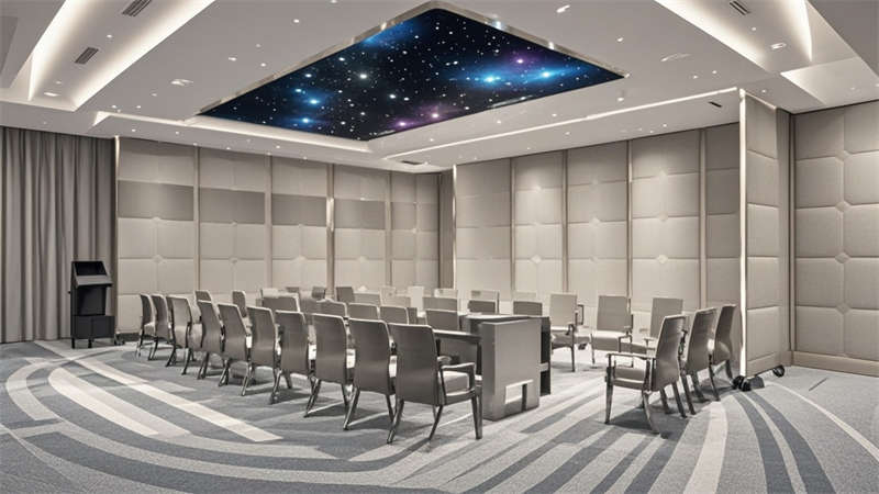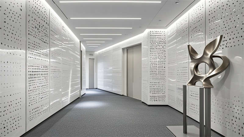 辦公區采用模塊化布局,配置智能升降桌和人體工學椅,裸頂噴灰工藝結合軌道燈系統實現靈活照明。色彩體系以高級灰為基底,搭配原木色系緩解視覺壓力,局部采用深藍跳色增強空間層次。材質運用注重環保性能,墻面大量使用穿孔吸音鋁板,地面采用防滑地膠與靜音地毯組合。