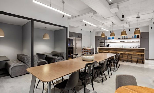 大型咖啡館和食品儲藏室是為協作而設計的,是辦公室的公共中心。一張長長的餐桌、展位、座位和休息區為非正式會議、社交聚會的地方。