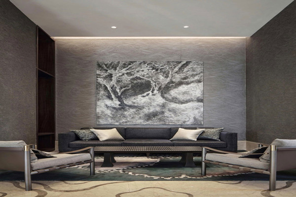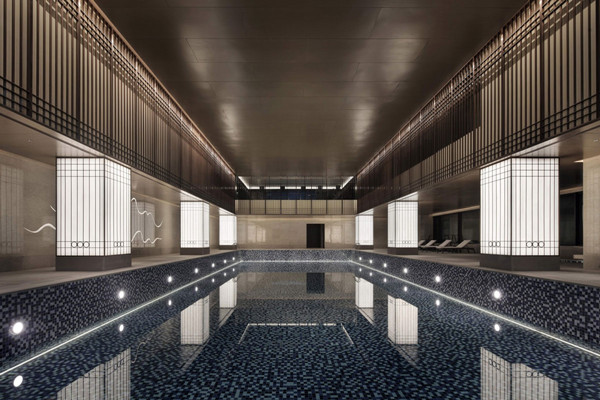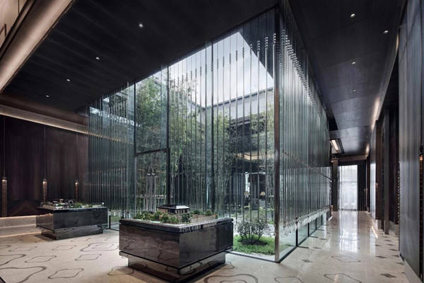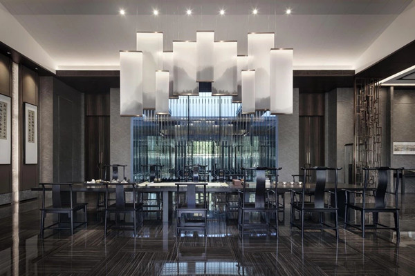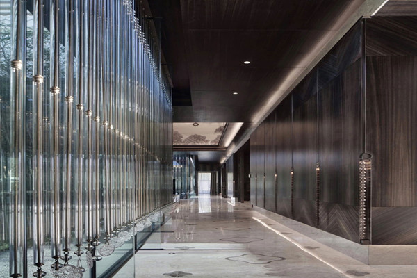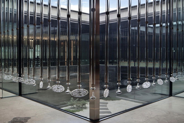 細致的從空間注入圓、點、線,繁縟而有節配上雅致玻璃吊飾,自然光映出流光溢彩,水的意象呈現東方肌理,光影交織突顯五重院落的建筑,彰顯東方大境。