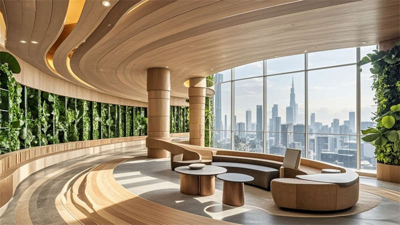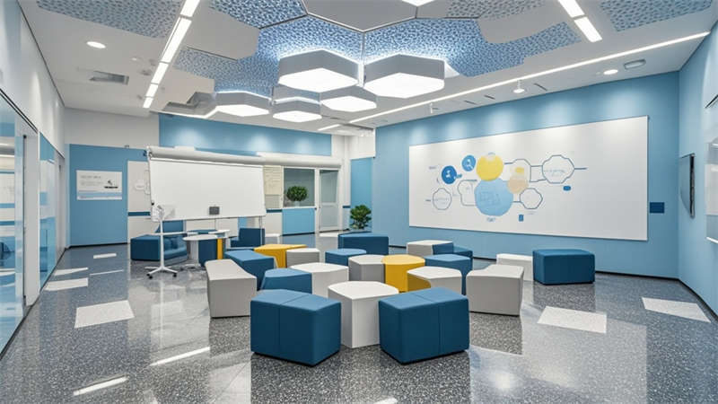 本1500㎡現代簡約辦公室設計以'高效協作·人文關懷'為核心,采用模塊化空間布局提升使用彈性。主色調選用淺灰、白、木三色系,局部點綴企業深藍色強化品牌認知。開放式辦公區采用1.2m×1.8m標準工位模塊,通過玻璃隔斷實現90%自然光滲透率。智能照明系統根據日照強度自動調節色溫,全年節電率達35%。核心筒改造區運用曲面木飾面弱化建筑結構,形成自然交流節點。聲學設計方面,蜂窩吸音板(NRC 0.85)與隔音艙(STC 52)組合控制噪音污染。茶水區采用磁吸軌道插座系統,支持設備靈活接入。所有家具均符合WELL建筑標準,辦公椅配備6向調節功能。通過BIM技術實現管線綜合,保留3.2米凈高營造開闊感。