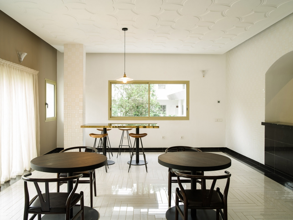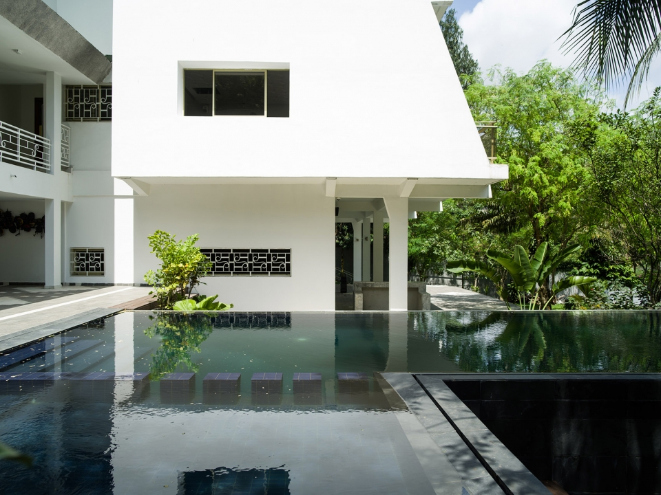 酒店外觀局部,建筑在泳池中投下倒影,部分外部視圖,池反射建筑物。健身房和養生區位于原建筑的廚房處,擁有良好的自然通風以及朝向。游泳池又長又窄,客人們可以在其中進行來回往復式的游泳運動,同時還在炎炎夏日里為客人們提供了一個消暑空間,當地樹木的葉子和開花植物則為泳池空間提供了遮陰處和裝飾。