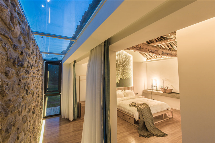 “隨著越來越快的生活節奏我們每天奔忙,每天遺忘城市越來越近,鄉村卻越來越遠”。這所名為“畫框里”的民宿位于水泉子村,而名字寓意為將百里畫廊的山水美景留在畫中院中。可看到名副其實靈動的山水畫這四季的變幻,凝集了我們對生活所有的向往。落地窗邊放置了浴缸做一個泡泡浴一眼望去是院落的美景和遠山的意境。主臥空間很寬敞,新中式的原木配灰色的簡易家具些許的現代元素金屬攝影燈使房間內多一份輕松感。