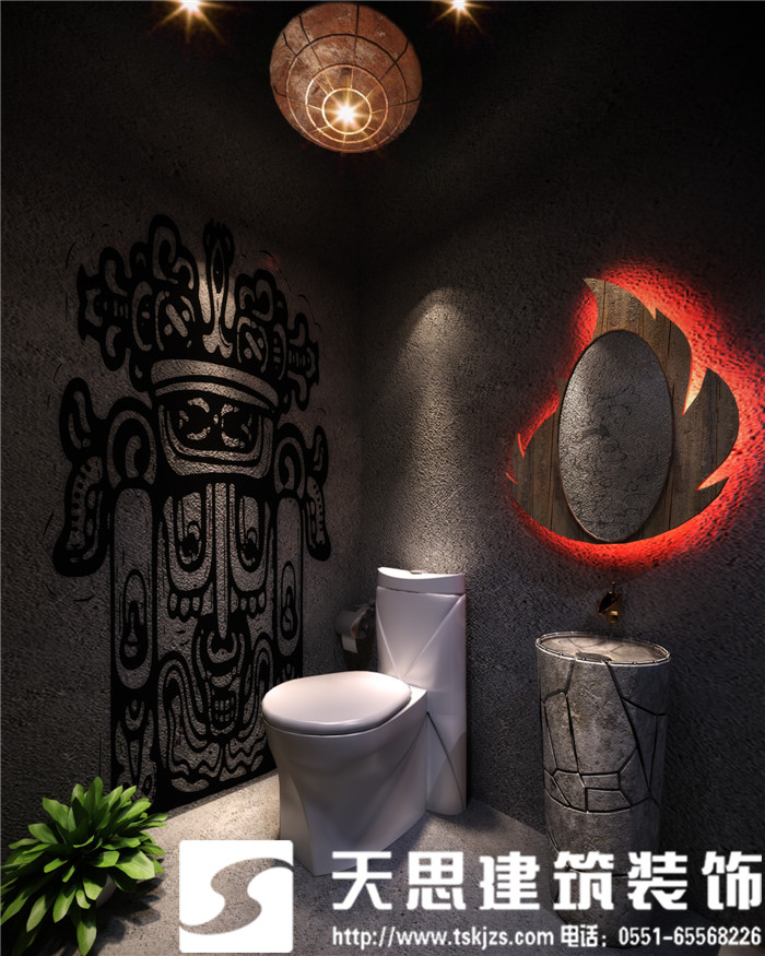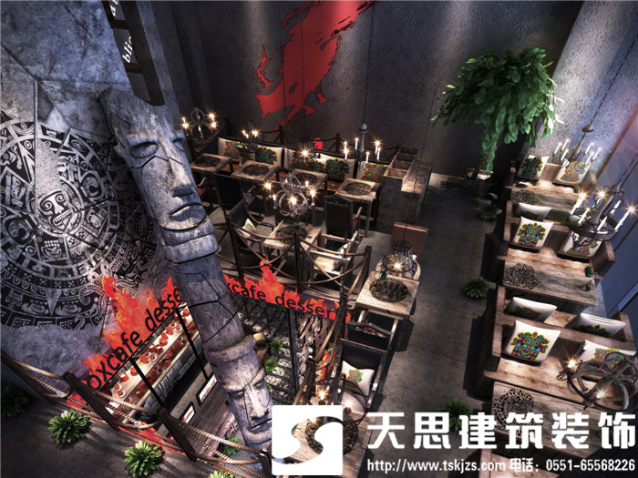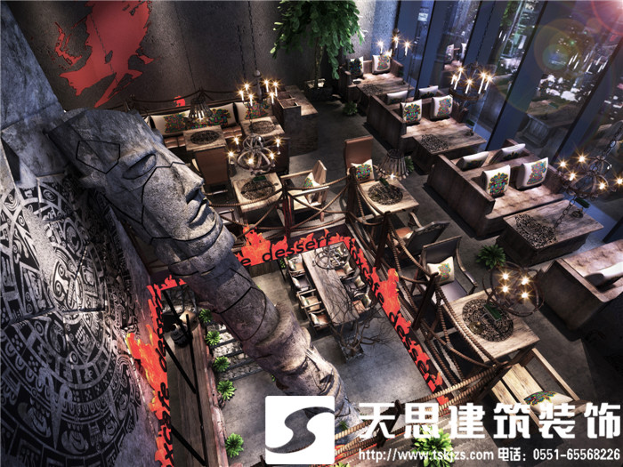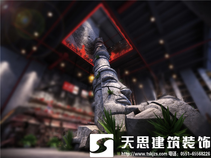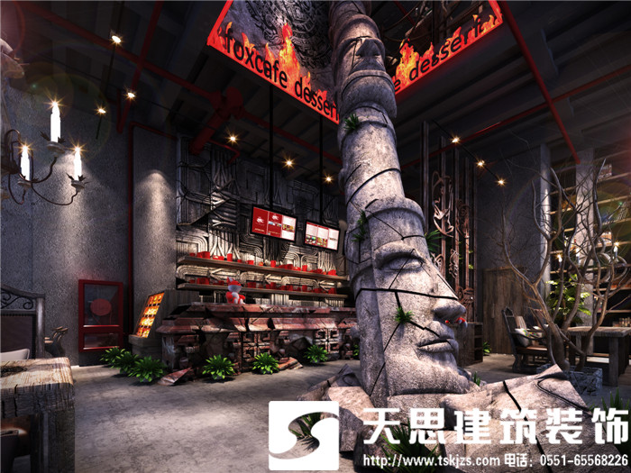 此案運用破碎的瑪雅建筑紋理作為主元素貫穿整體空間設計,將消失的瑪雅文化融入到設計風格里,用藝術化自然化的設計手法將簡陋的空間置換為國際潮流空間設計風尚。僅用一根從底層直穿二樓的人面雕塑就巧妙規避了空間的局促感,成為整體空間設計最凝練的一筆。整體空間基調沉穩,清水混凝土、石頭以及原木都為統一的暗色系,為了突出火狐的特色,將紅色引入空間,不僅活躍了空間,也讓品牌形象悄然流露。
