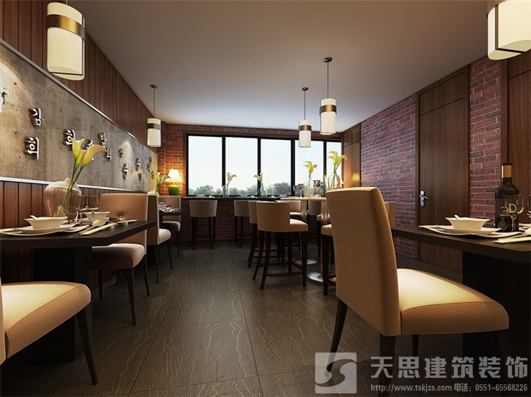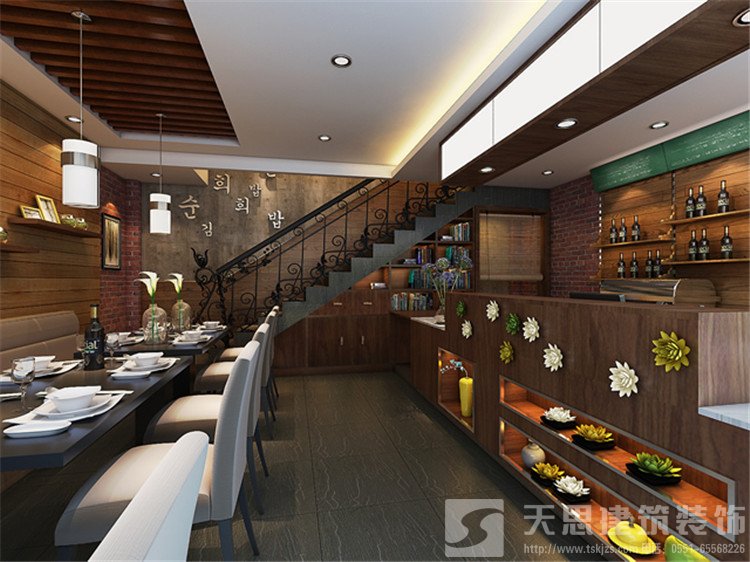 韓國紫菜包飯屬于一家連鎖店,在合肥目前有接近10家分店,在裝修風格上結合了地域文化特點,韓國人的居住空間比較狹小,對空間的利用非常緊湊。席地而坐的生活習慣讓他們呈現出一種低姿態的,貼近自然的生活形態,居室的設計所呈現出來的是小家碧玉式的精致,沒有奢華和張揚。空間裝飾多采用簡潔、硬朗的直線條 ,反映出現代人追求簡單生活的居住要求,迎合了韓式家居追求內斂、質樸的設計風格。