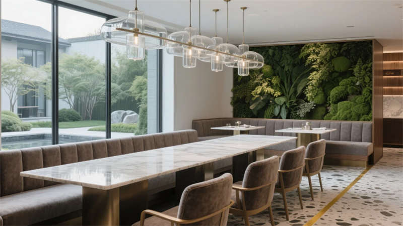 客房以中性色調為基底,亞麻、柚木與肌理墻面營造松弛感,智能化系統隱于無形,從電動紗簾到無線充電桌,細節中滲透科技溫度。雙床房的可移動屏風與定制家具,兼顧私密與靈活;衛浴空間以霧面玻璃與水磨石打造朦朧質感,啞光五金件點綴現代精致。餐廳以共享長桌與綠植墻激活社交氛圍,水磨石地面鑲嵌的黃銅線條如溪流蜿蜒,呼應徽派建筑中的流水意象。健身房鏡面與橡膠地面反射城市燈火,休憩區的皮質軟榻與漸變燈光,為運動后提供片刻寧靜。