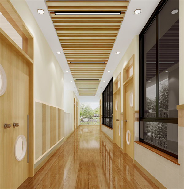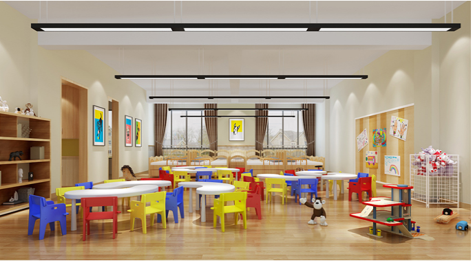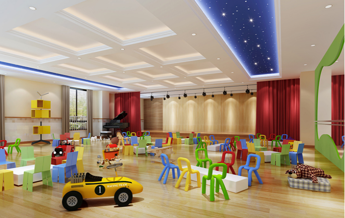 由于線條簡單、裝飾元素少,現代簡約需要軟裝來配合。如沙發與玩具等。軟裝到位是現代粉飾的關鍵。多功能的個性空間功能與空間組織,主要以木色為主,沒有太重,太跳的的顏色。以簡潔的造型和別出心裁的擺放,打造溫馨,優質的幼兒園環境。