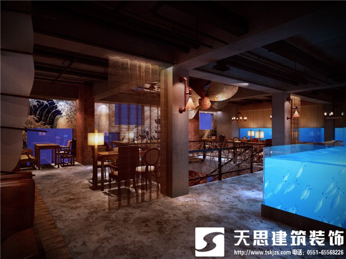 銅須水族主題會所,空間造型大氣磅礴,初入室內即被粗獷自然的設計所震撼。給人一種無限擴張的空間力量。空間材料和色彩的運用細膩而大膽,情節化的場景布置與戲劇性的張力設計營造出豐富的視覺享受。