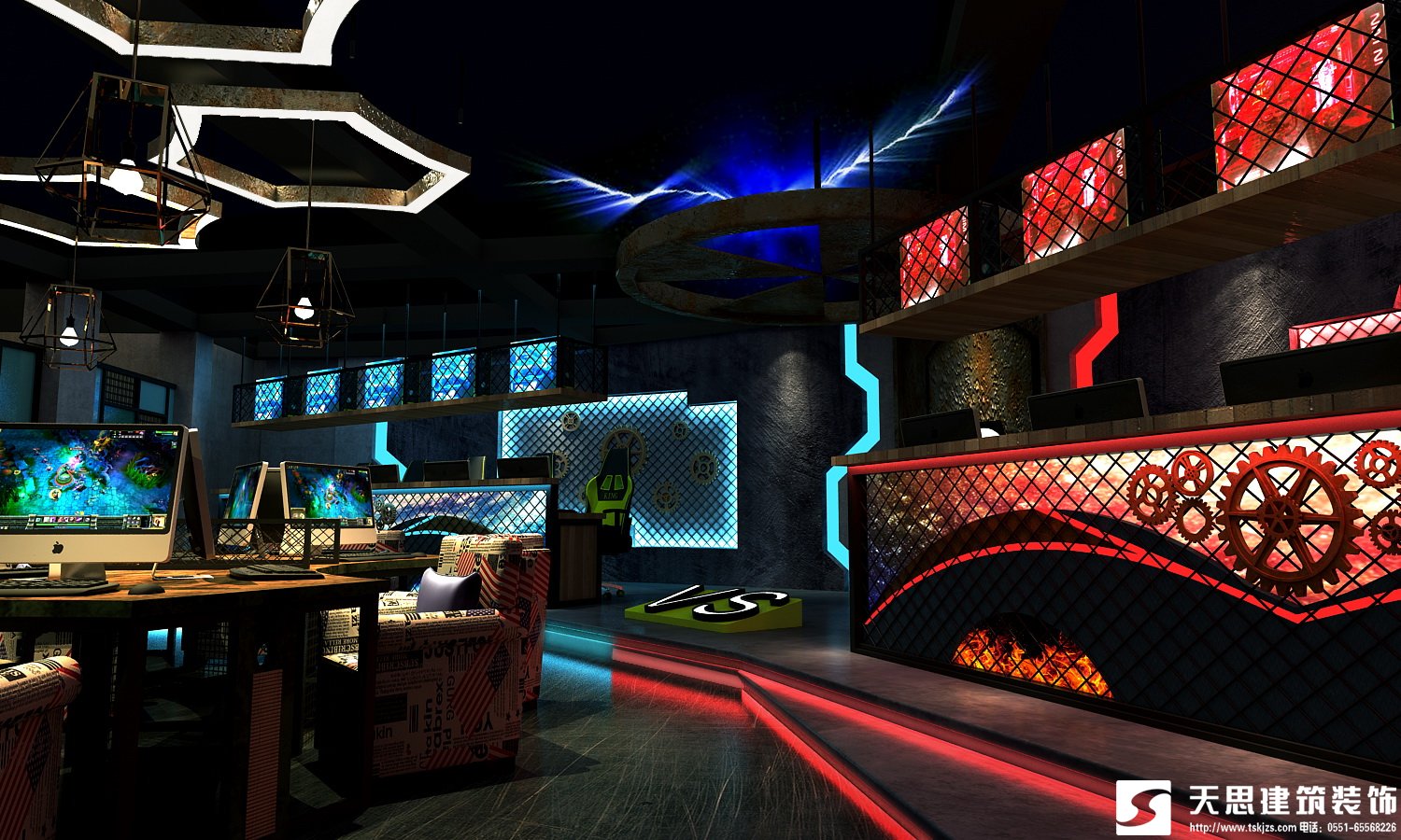網吧裝修設計包括網吧形象墻的設計,網吧墻面裝修、網吧門頭裝修、網吧室內裝修,對于小網吧的裝修來說,設計方面可能要稍微好做一些,因為網吧的裝修涉及到的包括走線、布局與分區、機器購置等等,當網吧有一定的規模的時候,網吧裝修的效果跟預想的還是有差距的.所以選擇裝飾公司,一定要慎重.