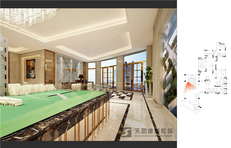 明確功能區:售樓處的各個功能區應相對獨立,不能給人“空間復雜”的混亂感。設計時,不能忽略門口、外圍、樓道等外部空間。