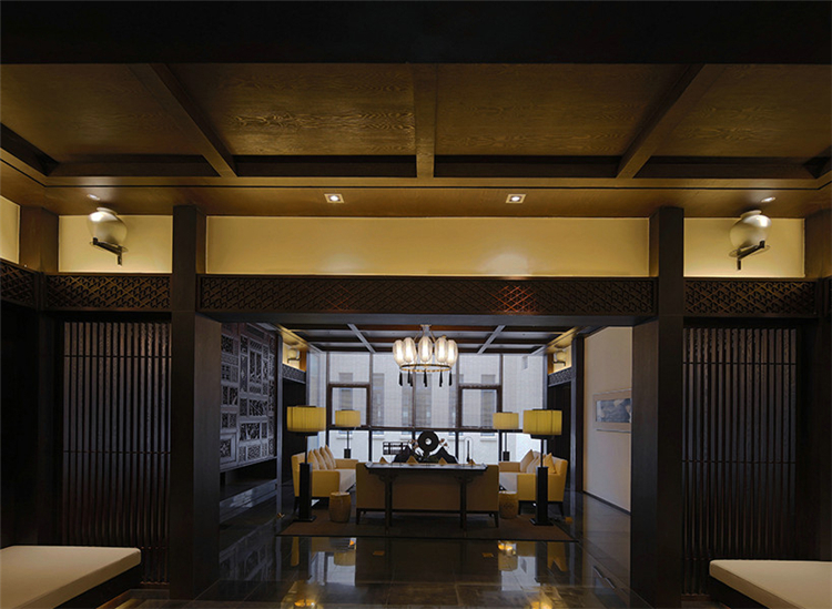 走入大堂,室內空間寬闊,天花鱗次櫛比通向樓梯方向,墻面灰色石材雕刻,將桃花源記中的詩句映入客人眼簾,禪境古意撲面而來。鏤空屏風隔墻的設計,讓空間隔而不斷,與具有傳統韻味的家具和配飾相互交融,打斷俗世的紛擾。柱子和天花上的裝飾燈具,利用金屬和木材兩種截然不同的材料和質地,創造空間內在張力,透過銳利的金屬、細膩的木質線條強調空間結構,精致筆挺的吊燈,令空間由內向外展現獨特魅力。