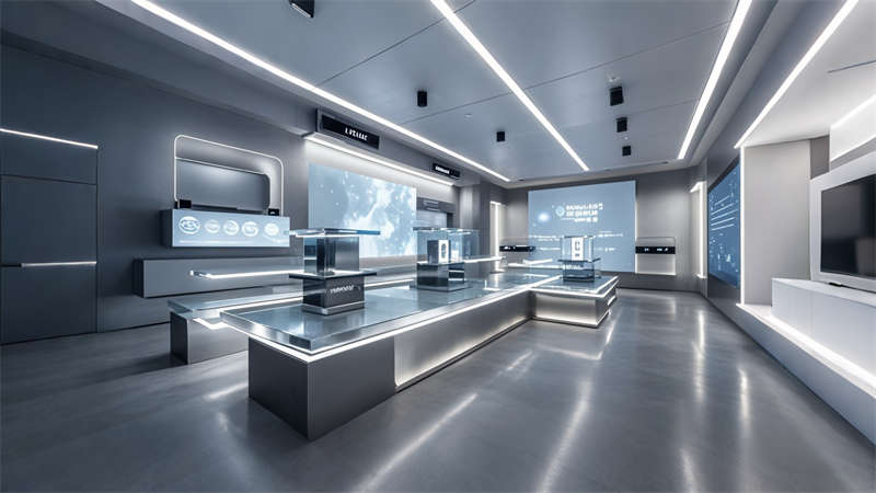 本 3000㎡辦公樓展廳采用 ' 科技人文 ' 設計理念,以灰白色為基調,企業藍為點綴色,打造現代簡約風格。空間規劃采用 ' 展辦融合 ' 模式,前廳設置 10 米通高數字藝術墻,產品區配置智能感應展臺。辦公區采用模塊化家具系統,搭配聲學處理隔斷。動線設計運用環形參觀路線,通過藍色導視光帶串聯各功能區。材質選用啞光金屬、木飾面與玻璃的混搭,科技感與溫潤感并重。照明系統采用 4000K 色溫 LED 線性燈,重點區域搭配軌道射燈。智能中控系統集成環境調節、安防監控和數字展示功能,實現空間高效運營。綠植墻和透光軟膜天花的設計,有效改善室內微氣候。