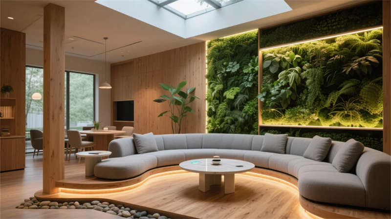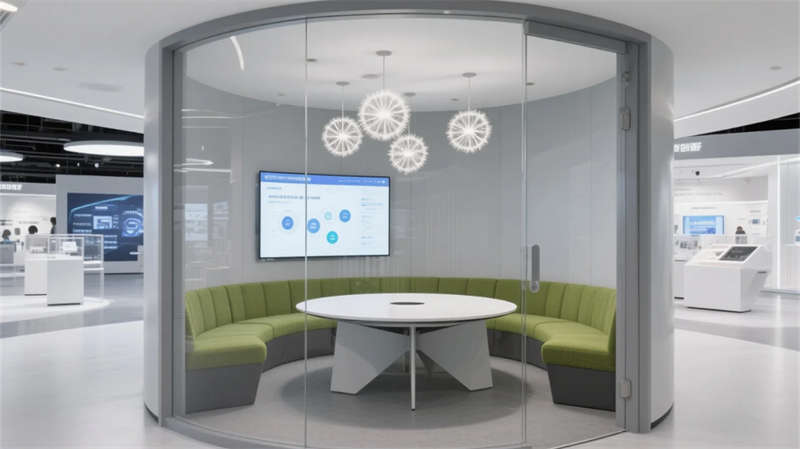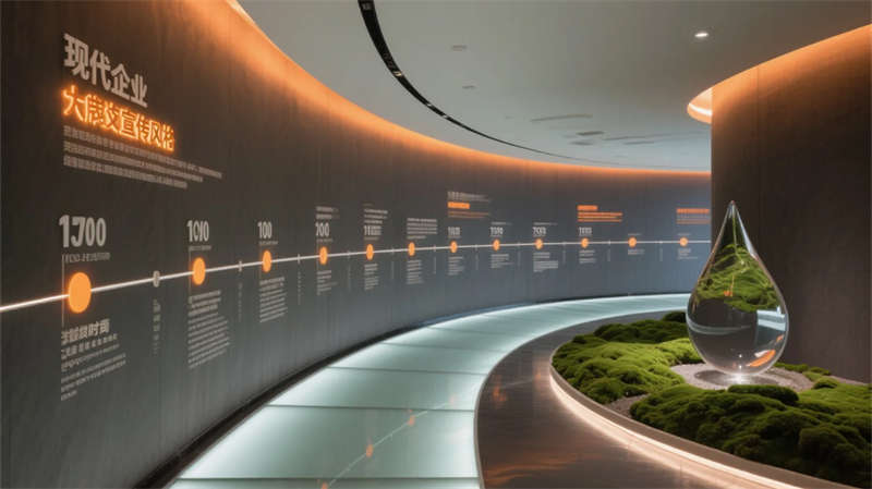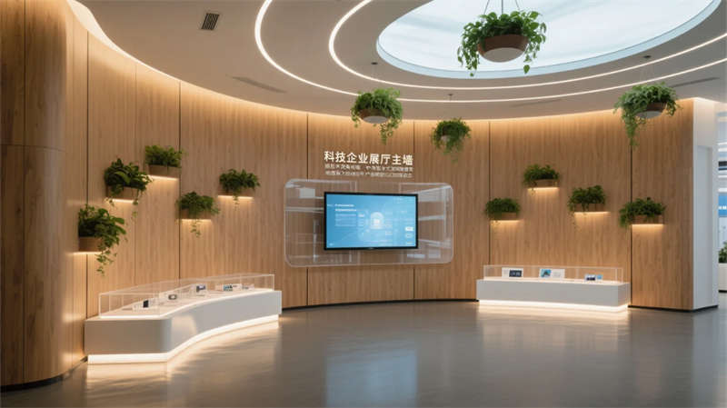 入口以光帶引導與生態綠墻開啟敘事,核心展區通過懸浮觸控與嵌入式展臺聚焦技術創新。數字沙盤區突破物理限制,以天地屏聯動呈現發展藍圖;智能會議艙可隨時轉化為協作中樞,通透隔斷維持空間對話性。文化長廊以光影步道承載企業精神,生態休憩區則借自然光影與苔蘚景觀構建減壓綠洲。
